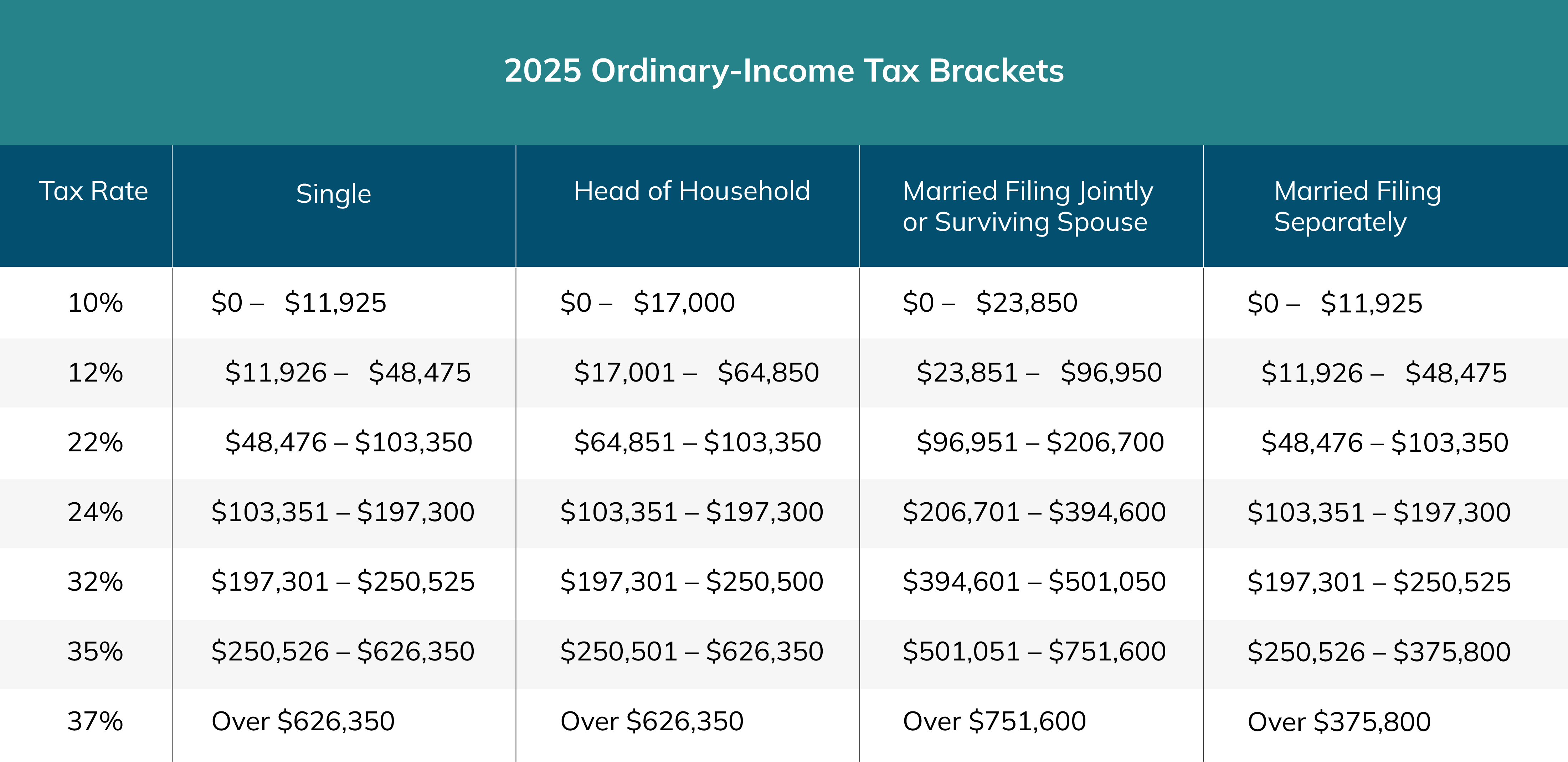 Note that under the TCJA, the rates and brackets are scheduled to return to their pre-TCJA levels (adjusted for inflation) in 2026 if Congress doesn’t extend the current levels or make other changes.