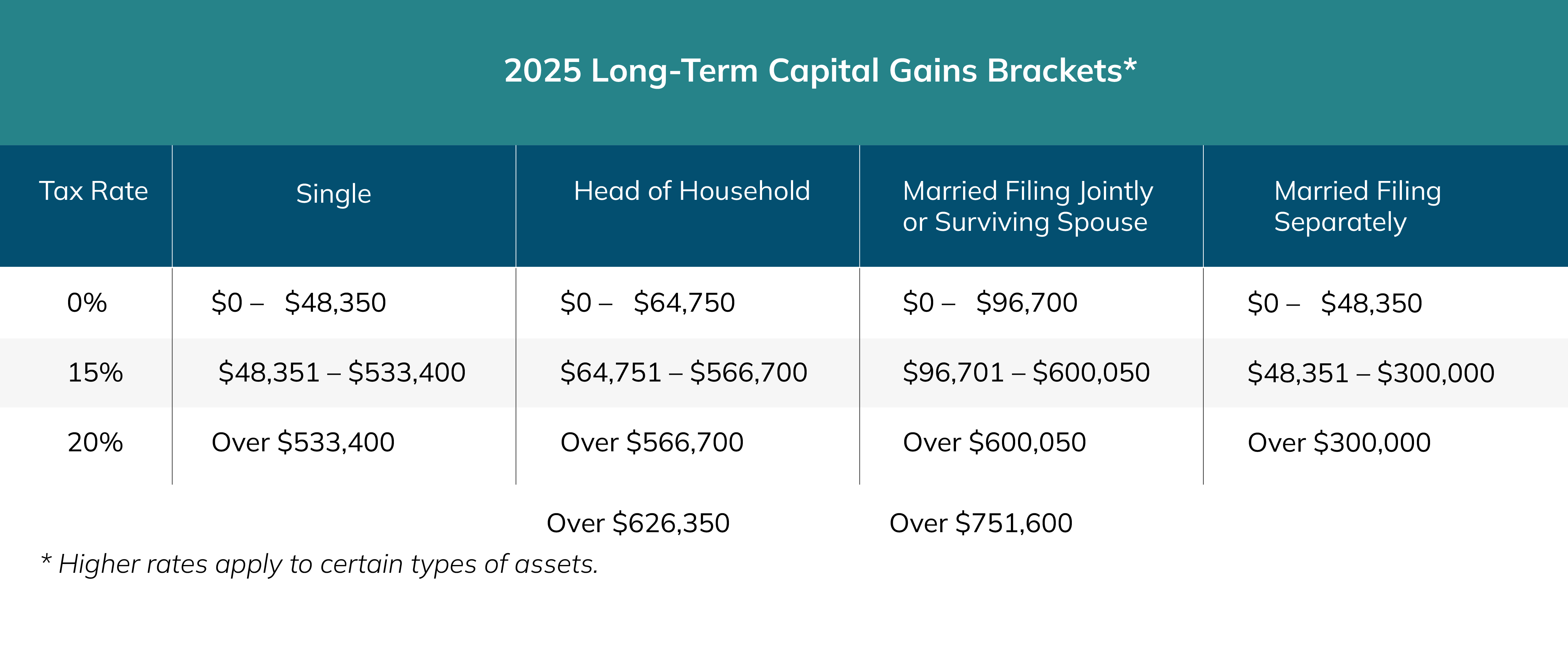 As with ordinary income tax rates and brackets, those for long-term capital gains are scheduled to return to their pre-TCJA levels (adjusted for inflation) in 2026 if Congress doesn’t extend the current levels or make other changes.