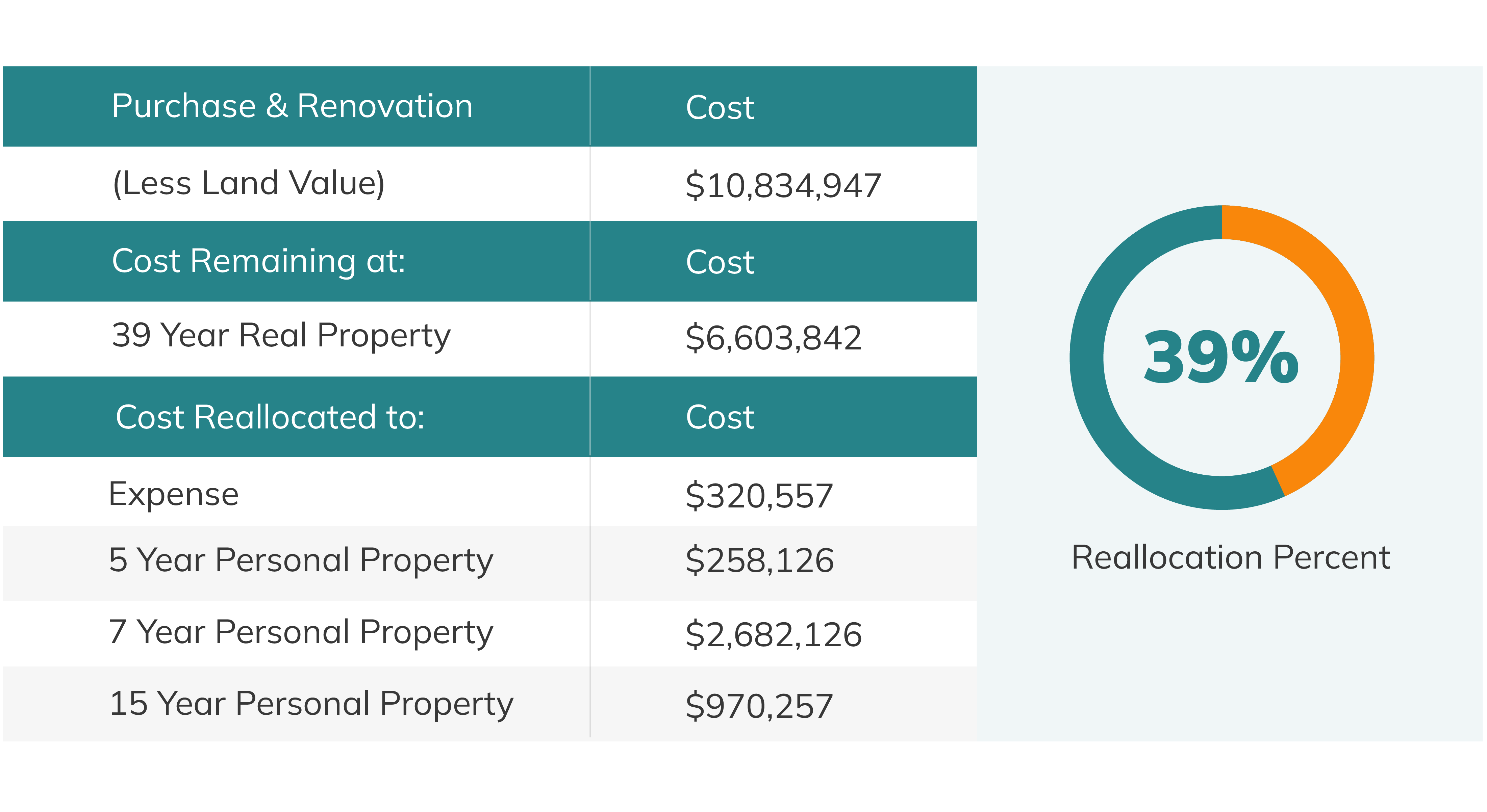 Approximately 39% of the project’s real property was reallocated to personal property, which has a shorter depreciable life or could be expensed. This acceleration in depreciation expense resulted in increased cash flow in years 1-5 of $589,070. Additionally, the company realized a $498,764 net present value benefit through the front-loading of depreciation expense (remember that the time value of money tells us that money available at the present time is worth more than the same amount in the future due to its potential earning capacity).